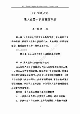 第一章 总 则 第一条 为了推进分公司法人业务的开拓,充分利用公司各种资源,抓好法人业务大项目的公关、风险评估、产品包装组合、售后服务等工作,特制定本办法。 第二章 法人业务大项目小组的组成与职责 第二条 法人业务大项目小组的组成 法人业务大项目小组由总公司法人业务管理部相关人员、分公司法人业务...