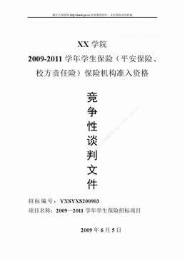 XX学院 2009-2011学年学生保险(平安保险、校方责任险)保险机构准入资格 竞 争 性 谈 判 文 件 招标编号:YXSYXS200903 项目名称:2009—2011学年学生保险招标项目 目 录 第一部分…………………………………………招标邀请函 第二部分………………………………招标文件...